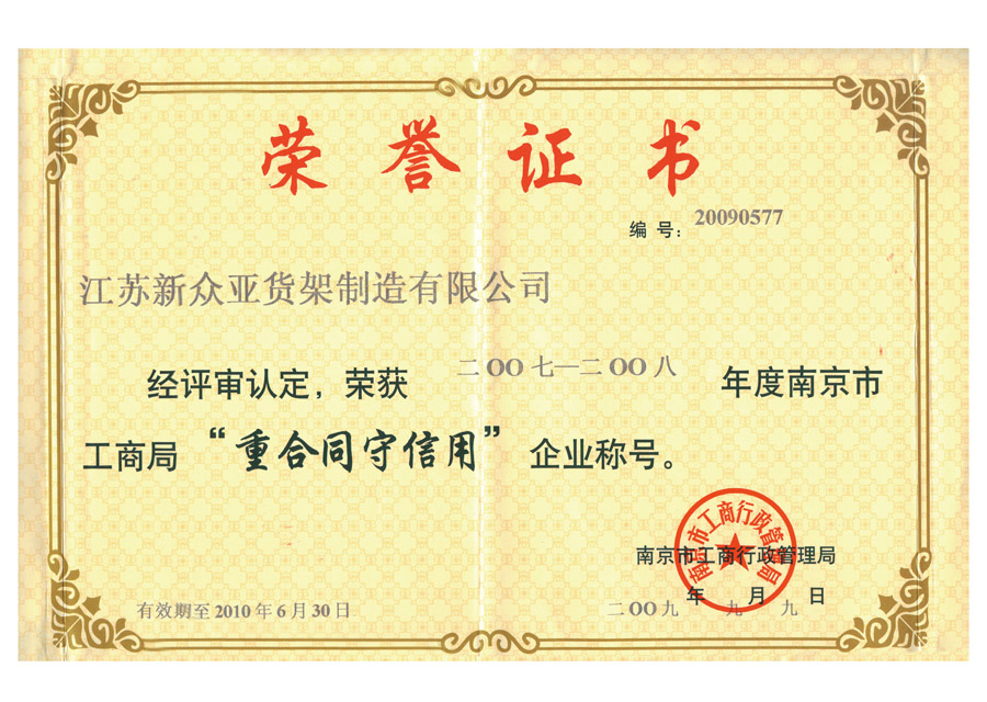 江蘇新眾亞貨架“優(yōu)秀誠(chéng)信合作企業(yè)”