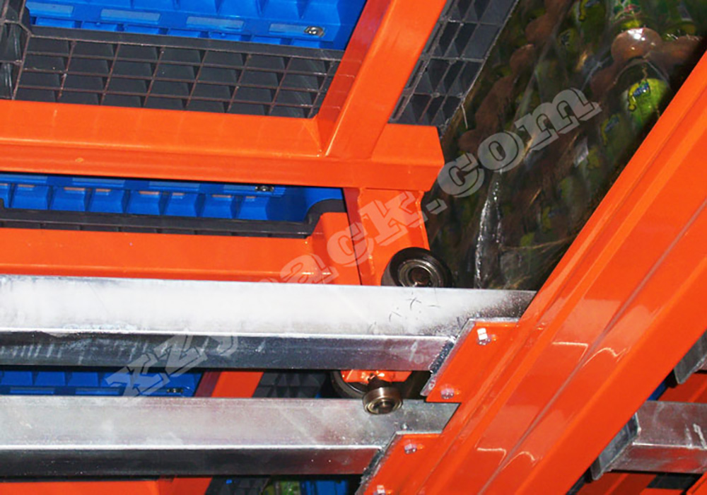 高密度存儲的貨架之一,適合少品種大批量貨物存儲。依據(jù)“先進先出”的原則,托盤放置在運載臺車上依次延傾斜的軌道被后推至貨架內(nèi)部,有效深度一般4個托盤,取貨時第一個托盤提取后,下一個托盤自行滑至取貨點,尤其適合于倉庫單位面積造價較貴的倉庫,如冷庫等,安全性與運轉(zhuǎn)效率高于是駛?cè)胧截浖埽岣呤褂眯蕦τ诓孳嚥僮饕蟊锐側(cè)胧降?,只需要在通道口操作?