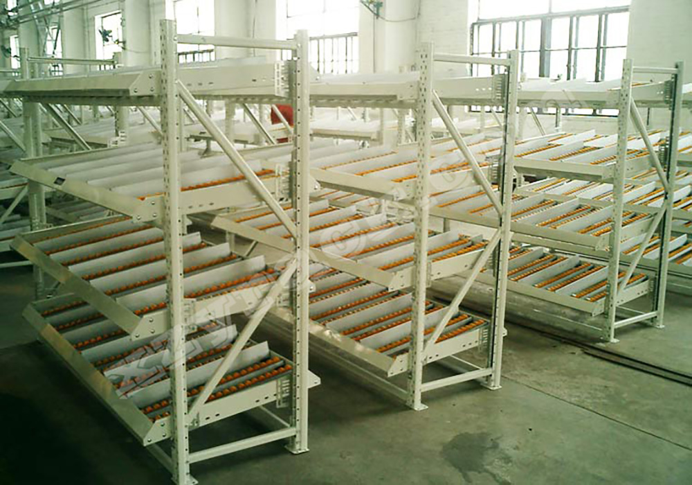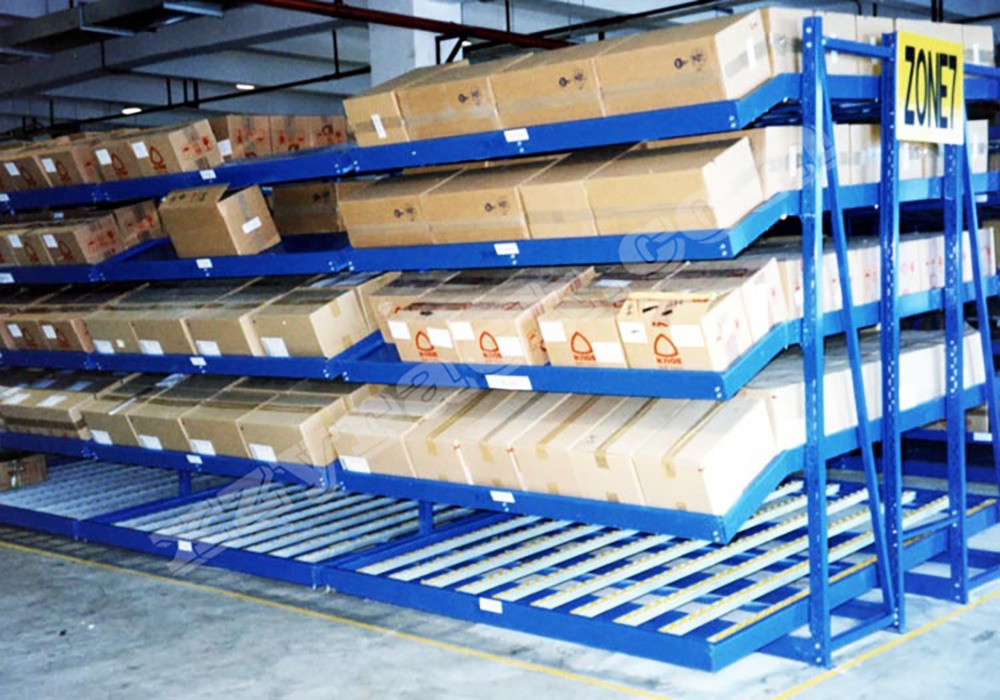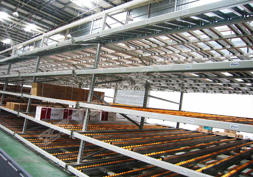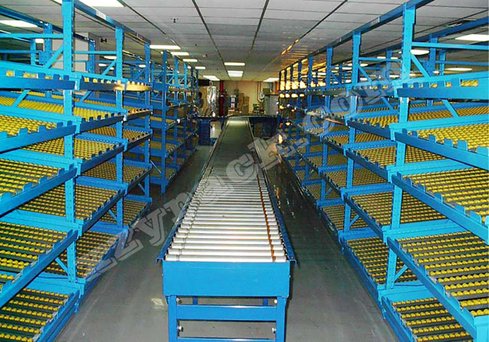 流利式貨架:采用輥輪鋁合金,鈑金等流利條,利用臺架自重實現(xiàn)先進先出,存儲方便,適用于裝配線兩側(cè)配送中心等場所。可配電子標(biāo)簽,實現(xiàn)貨物的輕松管理。將貨物置于滾輪上,利用一邊通道存貨,另一邊通道取貨,貨物在重力作用下向下滑動,在存放散貨時可很方便地為操作人員提供生產(chǎn)物品,加快生產(chǎn)流水線的工作速度,常用滑動容器有周轉(zhuǎn)箱,零件盒及紙箱,適合大量貨物和短期存放和揀選。