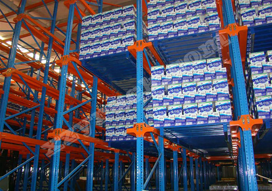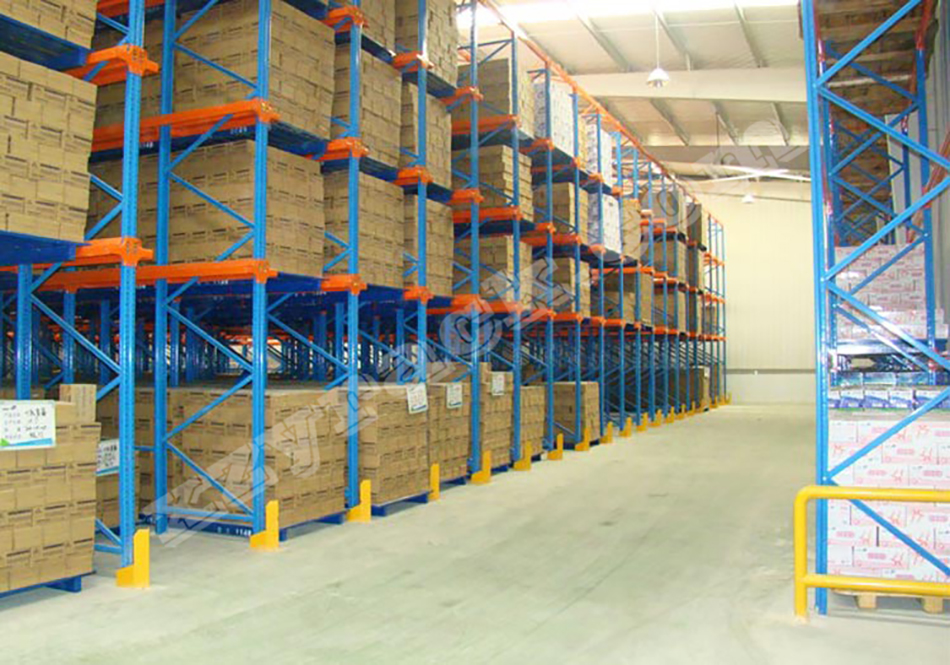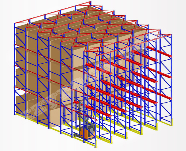 通廊式貨架又叫駛?cè)胧截浖堋⒇炌ㄊ截浖埽且环N不以通道分割的、連續(xù)性的整棟貨架,在支撐導(dǎo)軌(牛腿梁)上,托盤按深度方向存放,一個(gè)緊接一個(gè),這使得高密度存放成為可能。駛?cè)胧截浖苓m用于品種少、數(shù)量大的貨物存放,常用于存放大批同類型貨物,對(duì)空間利用較高,適合于食品行業(yè)、化工行業(yè)、制衣行業(yè)、冷庫(kù)等存儲(chǔ)空間成本較高的場(chǎng)合,其單位場(chǎng)地的儲(chǔ)存成本相對(duì)較低。